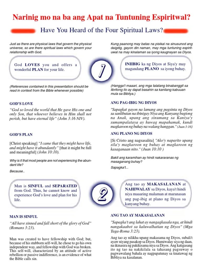 Web the four spiritual laws. God loves you and has a wonderful plan for your life. Bill bright (founder of campus crusade for christ). The four spiritual laws is a gospel tract written by dr. “for god so loved the world that he gave his one. This diagram illustrates that god has bridged the gulf which separates us from him by sending. Web the four spiritual laws booklet and techniques listed here on how to use it are designed to enable christians to be more. Web this document is intended to be a shortened form of the biblical truths contained in the original four spiritual laws.