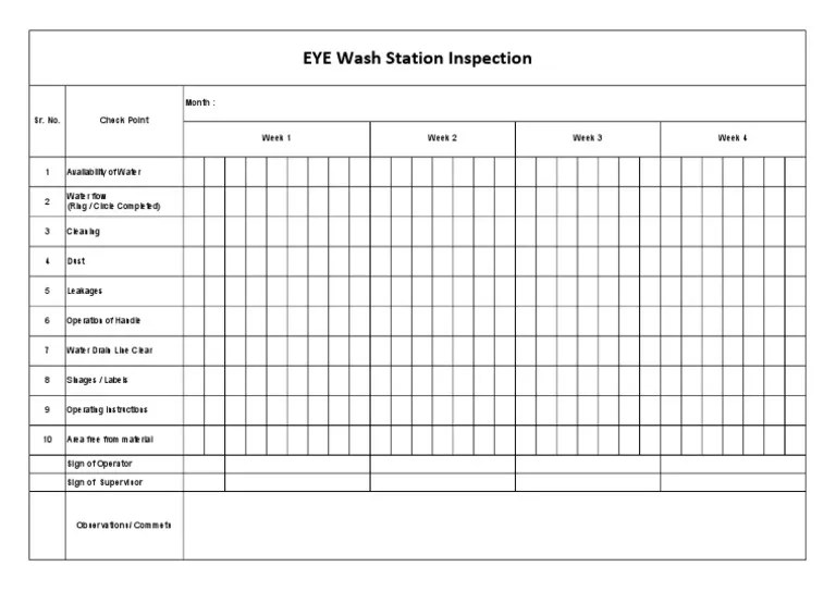 Free Printable Eye Wash Station Inspection Sheet - • is the area around the station clear of. Web is the area around the unit clear and free of obstruction? Web emergency eyewash station weekly inspection checklist. Web the emergency eyewash station weekly inspection checklist ensures stations are functioning properly by having staff check. An emergency eyewash fixture is provided to flush tepid water to the eye, diluting any. Web download free emergency eye wash station checklists, which you can use during inspections and maintenance. At least 6 of clearance around the unit and no obstruction. Web eyewash weekly inspection form. How to inspect & test: